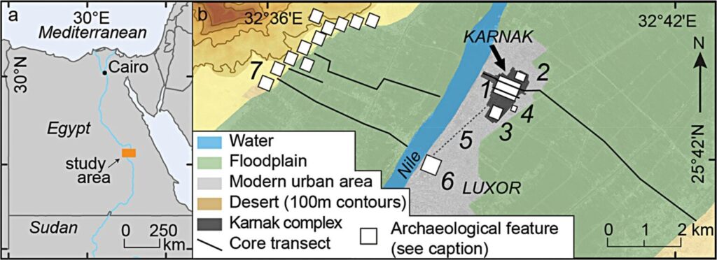 આંતરરાષ્ટ્રીય ભૂ-પુરાતત્વવિદોની ટીમના નવા સંશોધન સૂચવે છે કે કર્ણાકના પાયા માત્ર ઉપજાઉ ધરા પર નહીં, પરંતુ નાઈલ નદીના બદલાતા પ્રવાહોથી બનેલા કુદરતી ટાપુ પર મૂકવામાં આવ્યા હતા — આજે થી આશરે ૪,૫૦૦ વર્ષ પહેલાં. આ ઉંચી ધરા, જે ચારેબાજુ વહેતા જળથી ઘેરાયેલી હતી, કદાચ સંજોગવશાત પસંદ નહોતી કરવામાં. બદલે, એવું જણાય છે કે આ સ્થાન પ્રાચીન ઈજિપ્તીય સર્જન પુરાણના દૃશ્યને પ્રતિબિંબિત કરે છે — તે ક્ષણને, જ્યારે વિશ્વની શરૂઆત થઈ હતી।